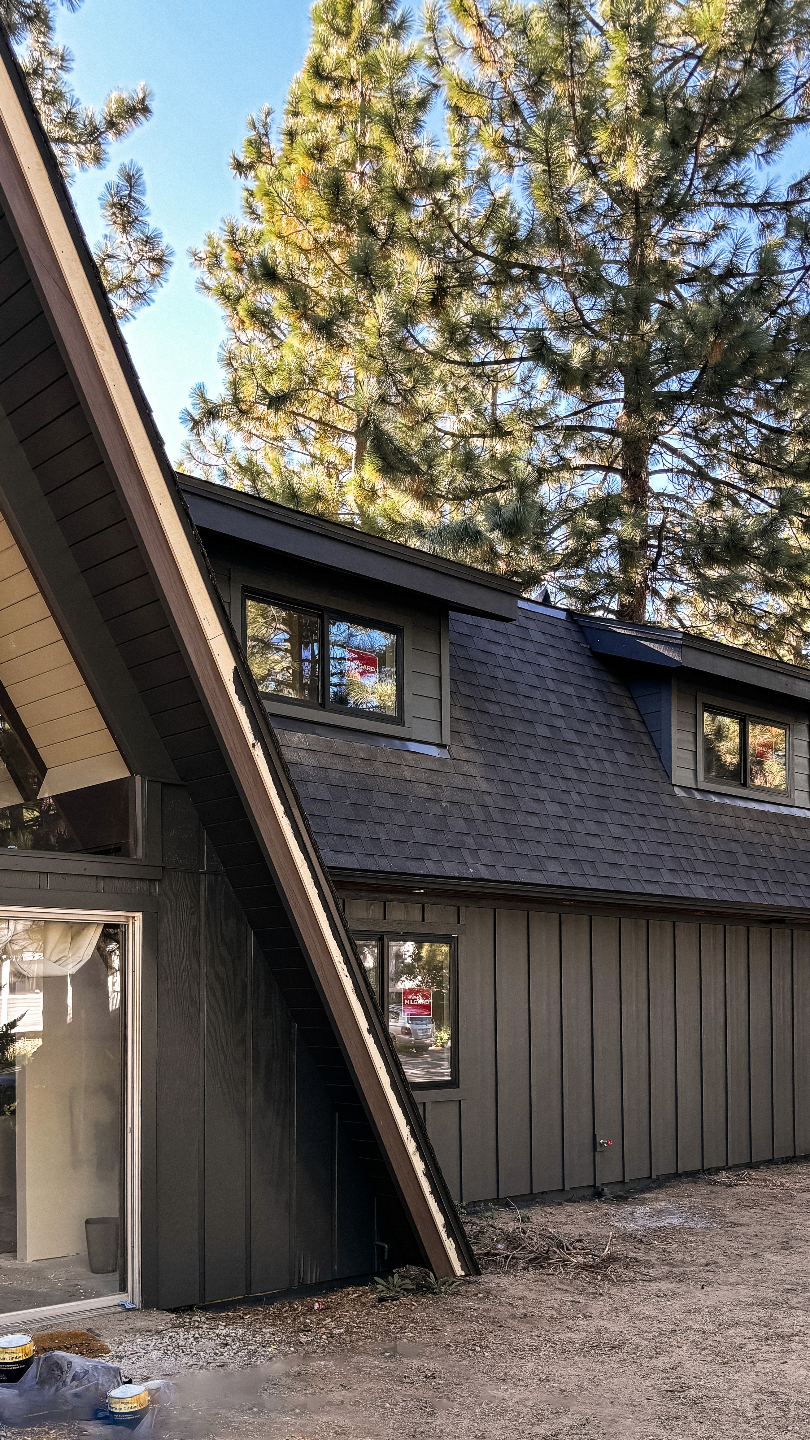 We added an addition onto this classic Tahoe A-frame from the 60s. Built for a growing family, they needed another bathroom, secondary primary and common play room upstairs, while reworking the downstairs bedrooms and bathrooms for better usability. New windows, sliders and a roof went on to replace the highly flamable shaker original roof. Architectural features of the original building were preserved where possible, like the central brick fireplace, T&G ceilings and wrought iron railings. A black exterior brings this mid-century into a modern CA aesthetic.
