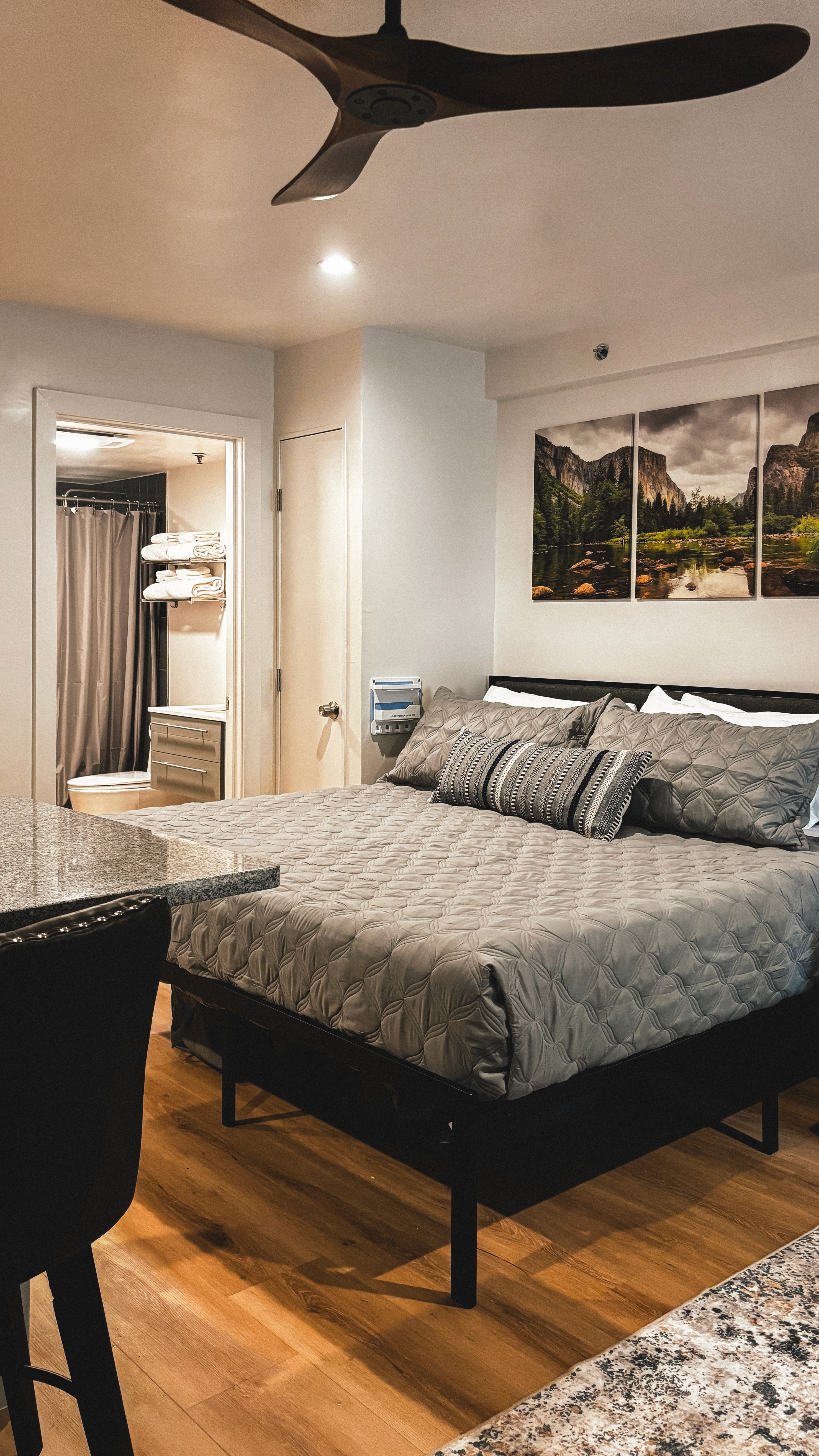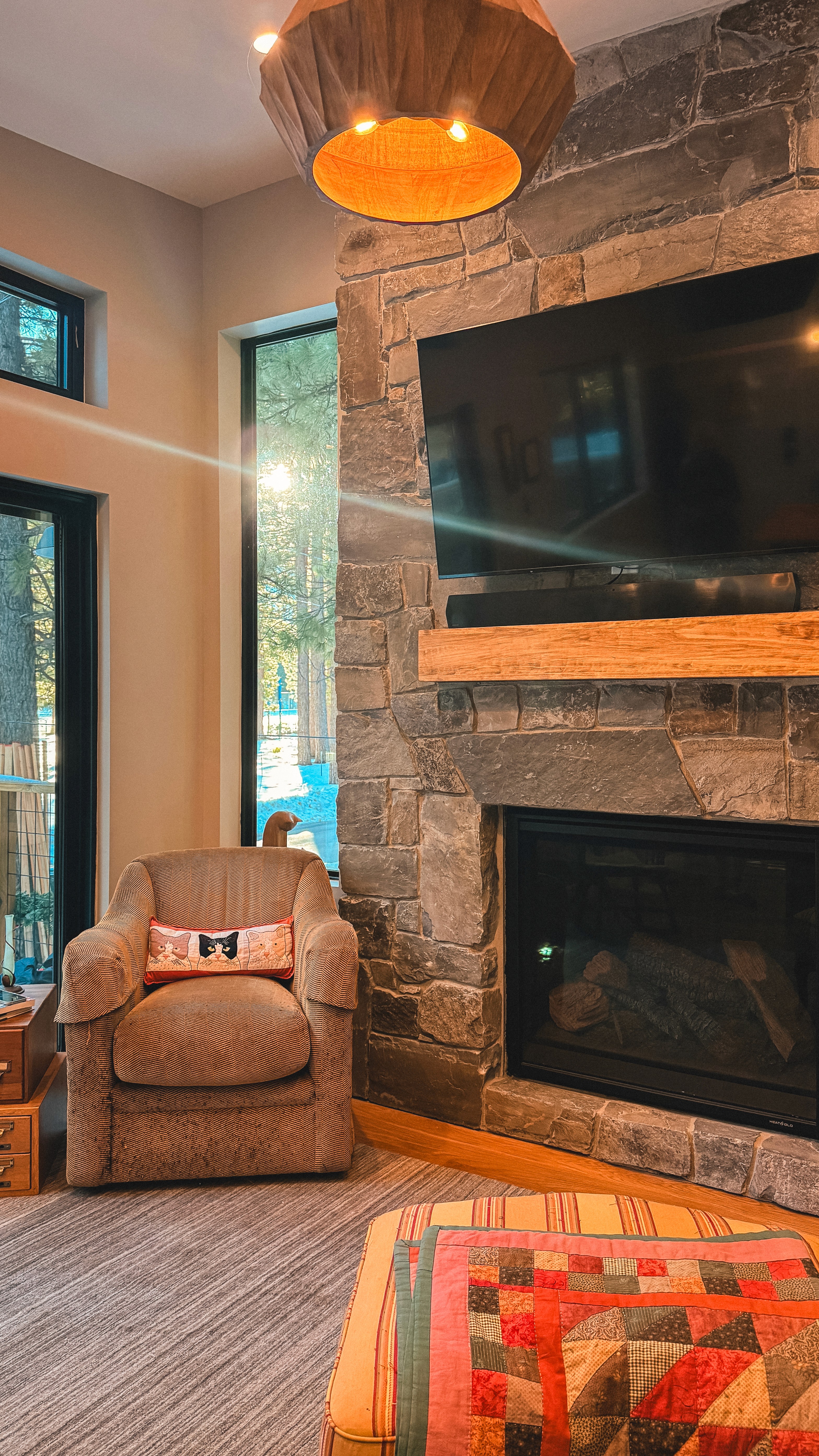 We revitalized this condo with a fresh, modern design, updating every aspect of it from the builder-grade finishes installed in the 90s. We reworked the layout to increase rentability, added a tile walk-in shower with sleek fixtures, added lighting, a gas fireplace, granite countertops from the same stone in Yosemite Valley and installed Fisher-Pakel appliances in the new kitchen. The final result is a beautifully crafted condo that enhances both comfort and functionality for a family vacation in Yosemite West.
